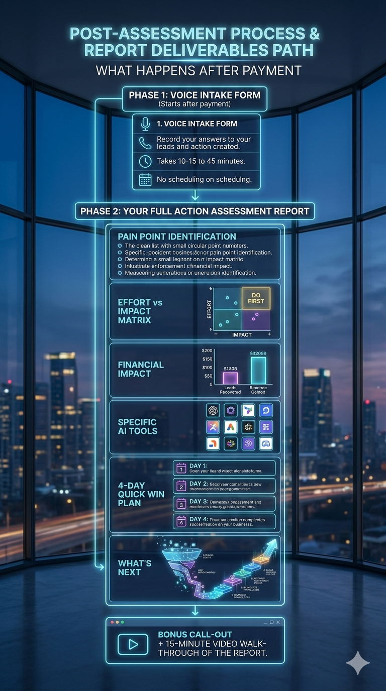 After payment you'll be directed to a short voice intake form. You record your answers to 8 questions about your current leads and sales situation. Takes 10–15 minutes. No scheduling. No waiting for a call.